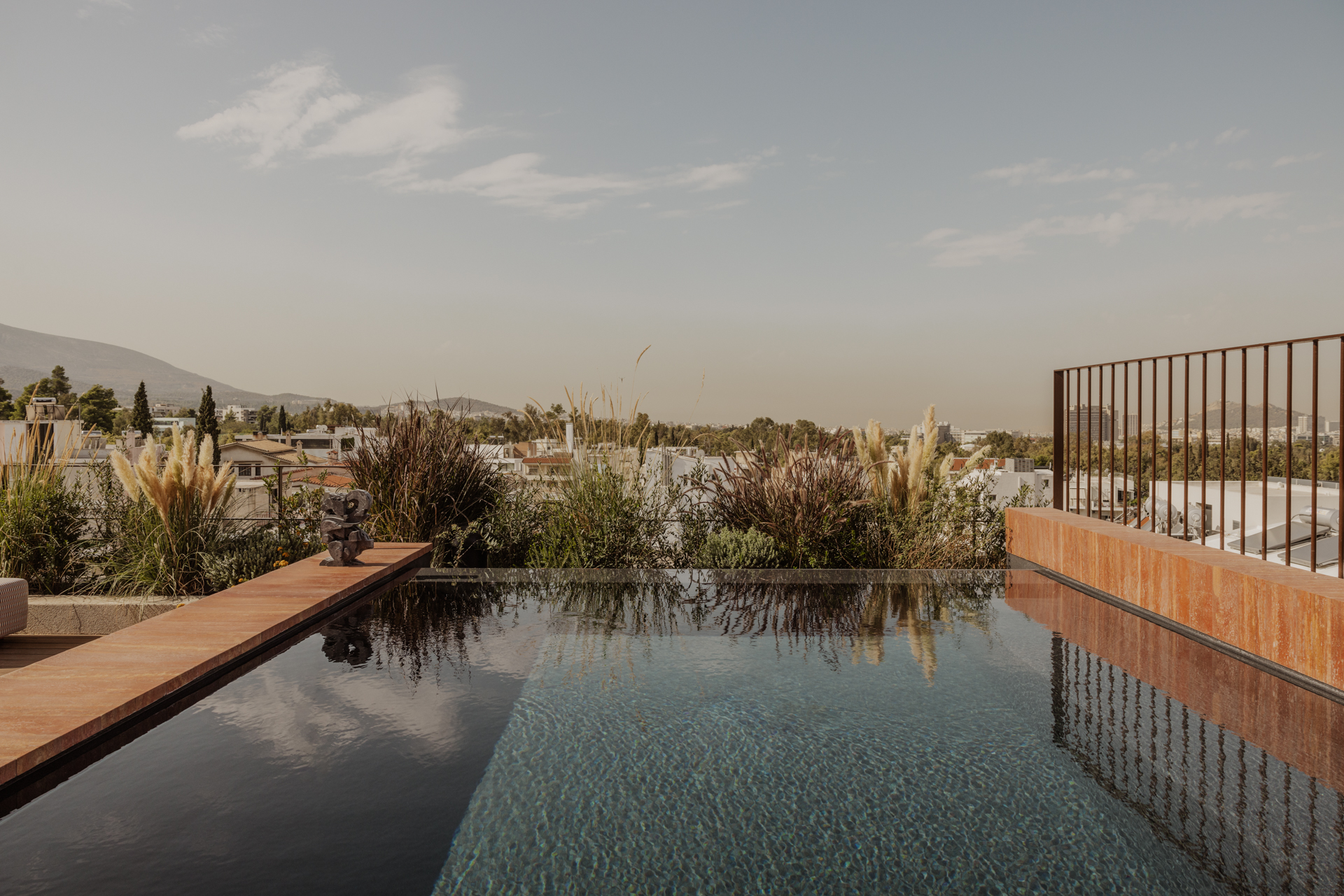 The residential building is confident and geometric, nodding to the spirit of the Golden Age of Papagou, a part of Athens largely developed during the 20th century and influenced by the International Style. At the same time, the design is softly sculpted using curves, timber details, and lush Mediterranean planting, gently nodding to modernist tones but allowing 21st-centuries considerations and aesthetics to shine.