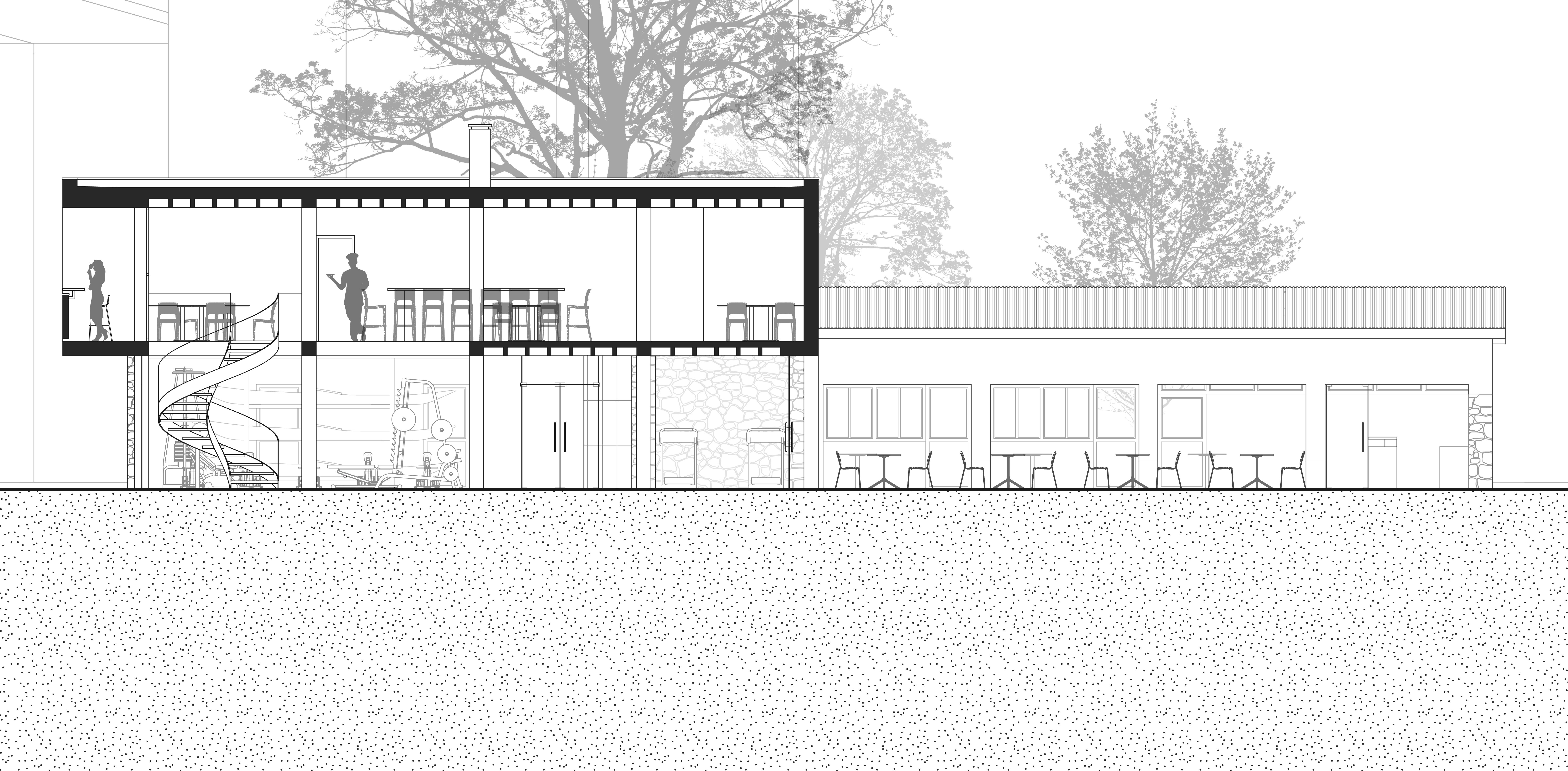 In the secondary building, the changing rooms and storage for rowers are placed in its western side, while the study café is placed in its eastern more social side. Openings are created to visually connect it with the lake.