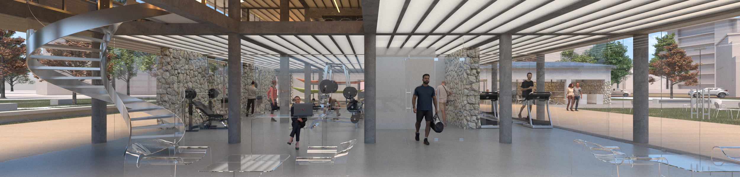 The ground floor is enclosed with glass behind the columns, defining the spaces for the gym and the main entrance/foyer.