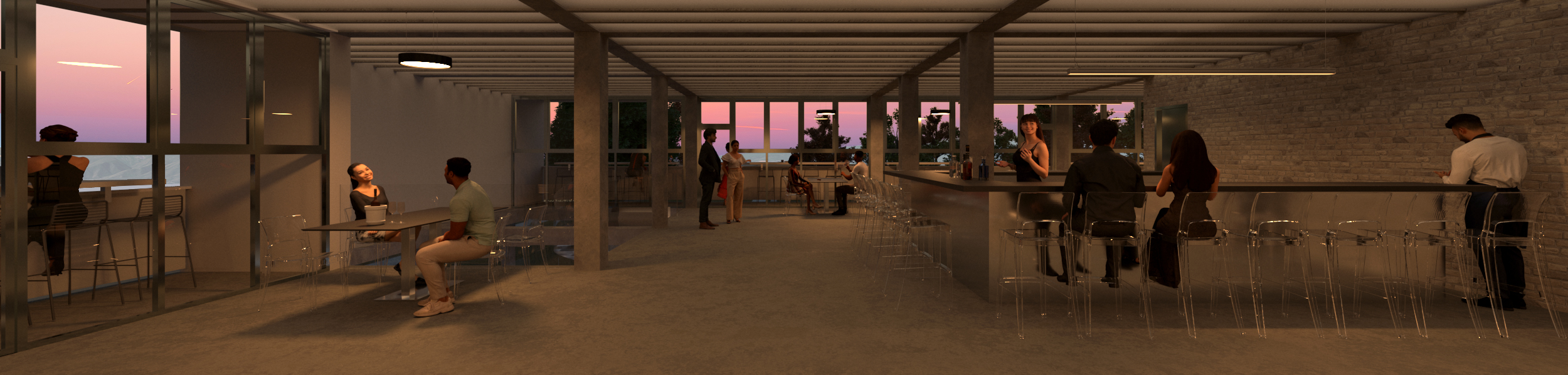Two important features of the restaurant/bar on the first floor are the uninterrupted views through the original openings and the use of the balconies as bar areas, offering a unique experience.